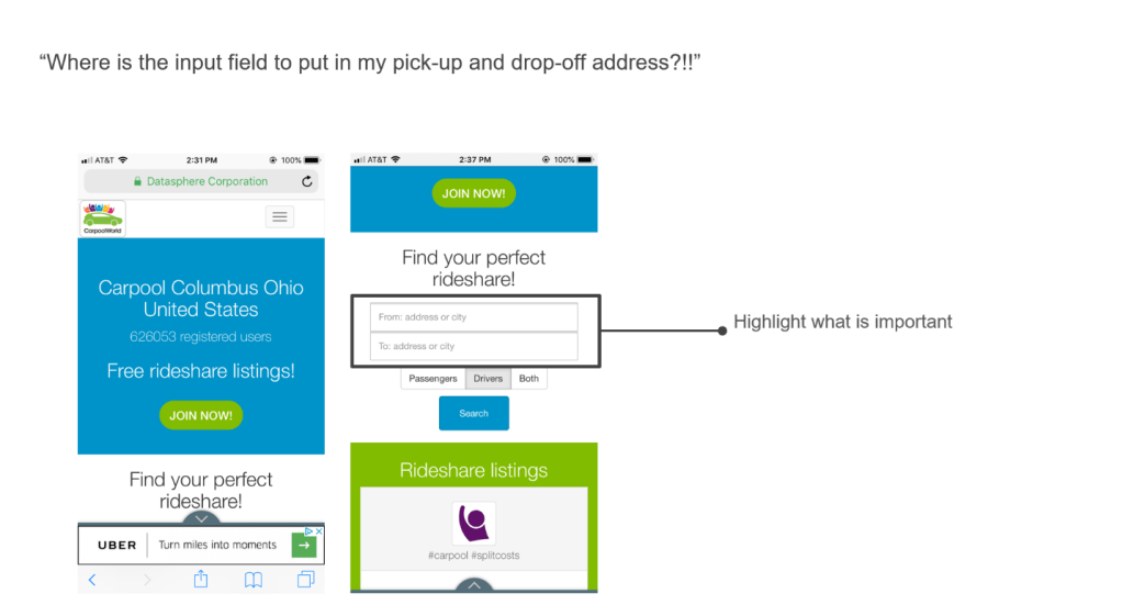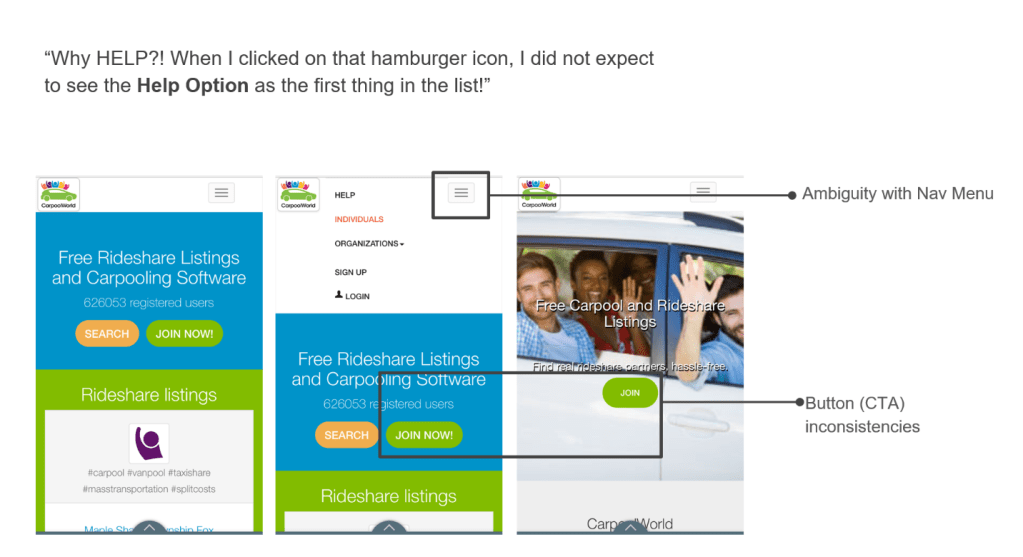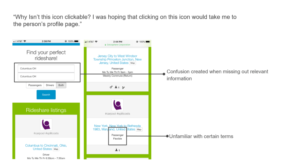 We conducted tests with some employees within the organizations by giving them simple tasks of creating an account and finding their first carpool on both, the existing platform and our prototypes.