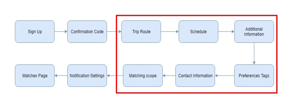 We focused on on-boarding as it was important for users to understand the purpose of the app and find their first carpool match. By this, they would see more value in the product. This flowchart shows the on-boarding flow of the current web-mobile app.