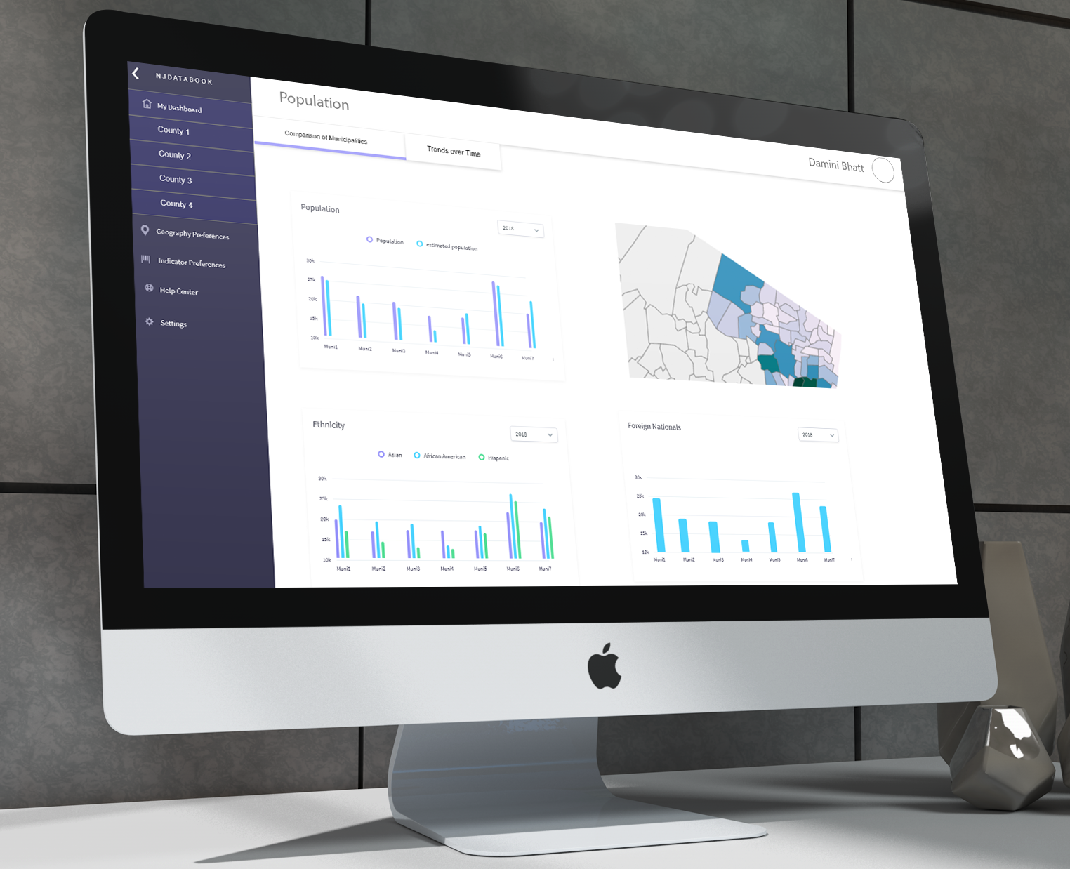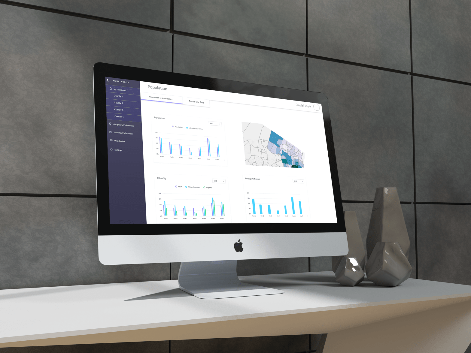 Concept 1 – Saving the search query on the existing interface. The current app requires users to create an account to search the NJDatabook. So the idea was allowing users to save their search query by keeping the geography and indicators selected on the UI. Also, creating some data visualizations for the results of the query along with data to download.